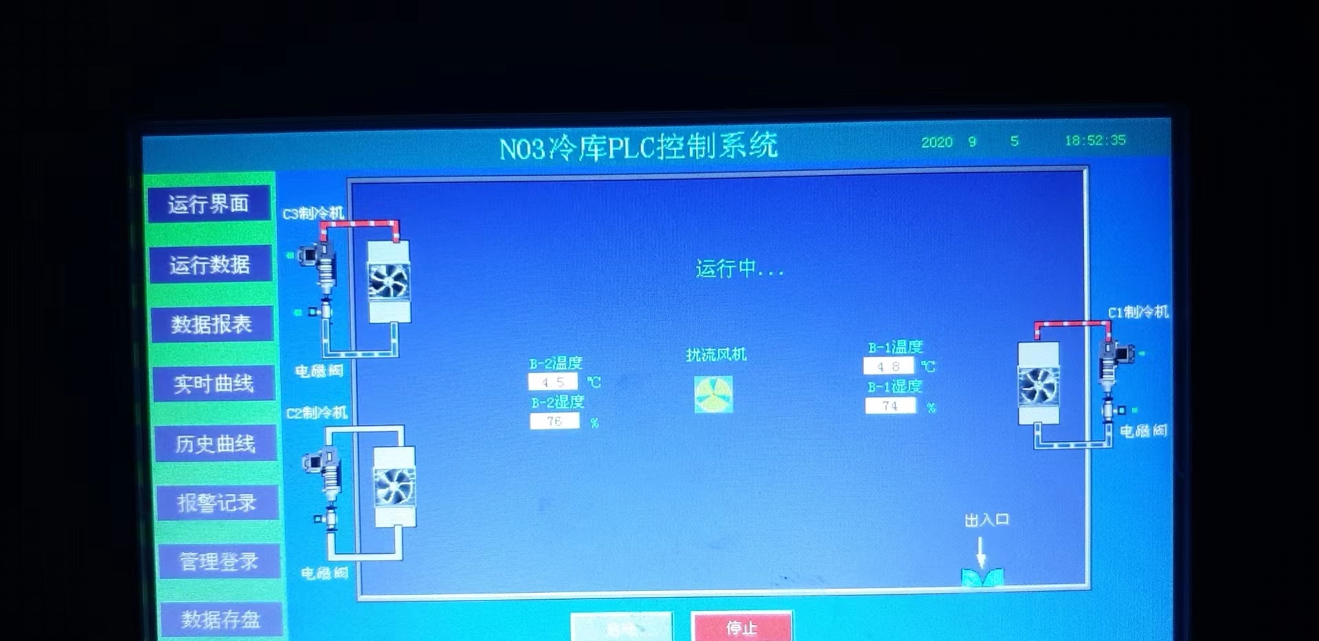 技术说明:程控制器(PLC)加触摸屏配套空气开关和接触器等对库区温湿度调控设备实现智能化控制;具备自动/手动控制自由地转换、运行状态显示、记录储存、历史事件及数据记录查询、导出等功能,同时具备温度超限、设备故障就地声光报警功能及短信报警功能,(配报警灯);库温取2-3个温湿度变送器平均温度值、库温均匀度超3度启动扰流风扇反之则停、短信报警器1个:能发送3~5个手机号码,具备温度超限、设备故障、PLC故障、主电源断电报警功能;380/36V变压器;求救报警器;配一组弱电UPS备用电源。