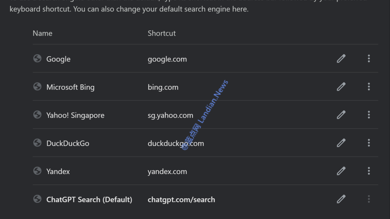 后续如果你不想使用 ChatGPT Search 也可以回到搜索引擎设置,点击其他搜索引擎后面的编辑按钮将其设置为默认搜索引擎即可。