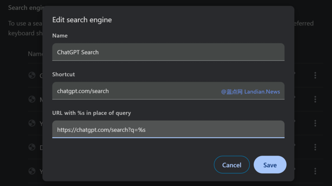 以上设置完成后点击保存,然后在同页面的搜索引擎里点击刚刚添加的 ChatGPT Search 的编辑按钮将其设置为默认搜索引擎即可,设置完毕后接下来 Chrome 地址栏的搜索都将通过 ChatGPT Search 完成。