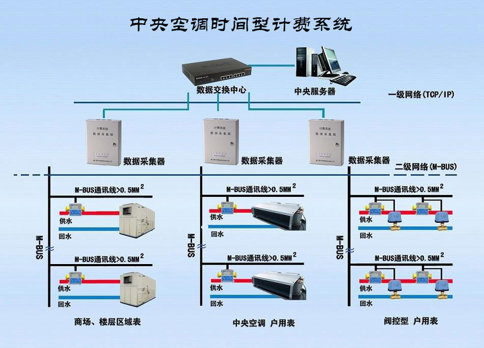 “能量型”计费系统是依据热力学“热交换”原理,通过能量“积算仪”对用户使用中央空调过程中交换的“热量”进行累加,实现对中央空调的分户计量,进而按使用的“热量”比例对总费用进行科学合理分摊的计费形式。该系统可以有效减少空调使用能耗,使中央空调的运行管理更加科学、合理、规范。