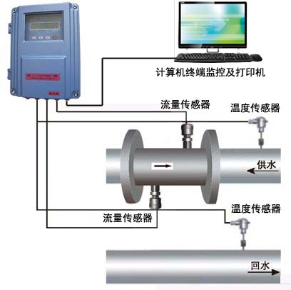 原理:在用户的进、回水管道上各安装一只温度传感器,并在进水管道上安装一台流量计。用流量计计量流经的冷冻水(或热水)流量的大小,用进水、回水的温差来计算能量的损耗,同时将温度信号和流量信号接入热量计算器。上位机监控系统根据热量计算器进行计费。